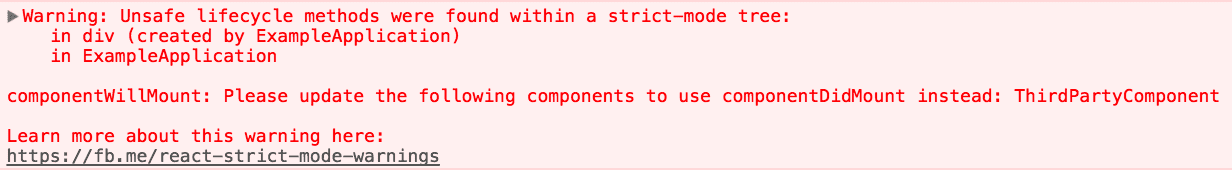 When strict mode is enabled, React compiles a list of all class components using the unsafe lifecycles, and logs a warning message with information about these components, like so: